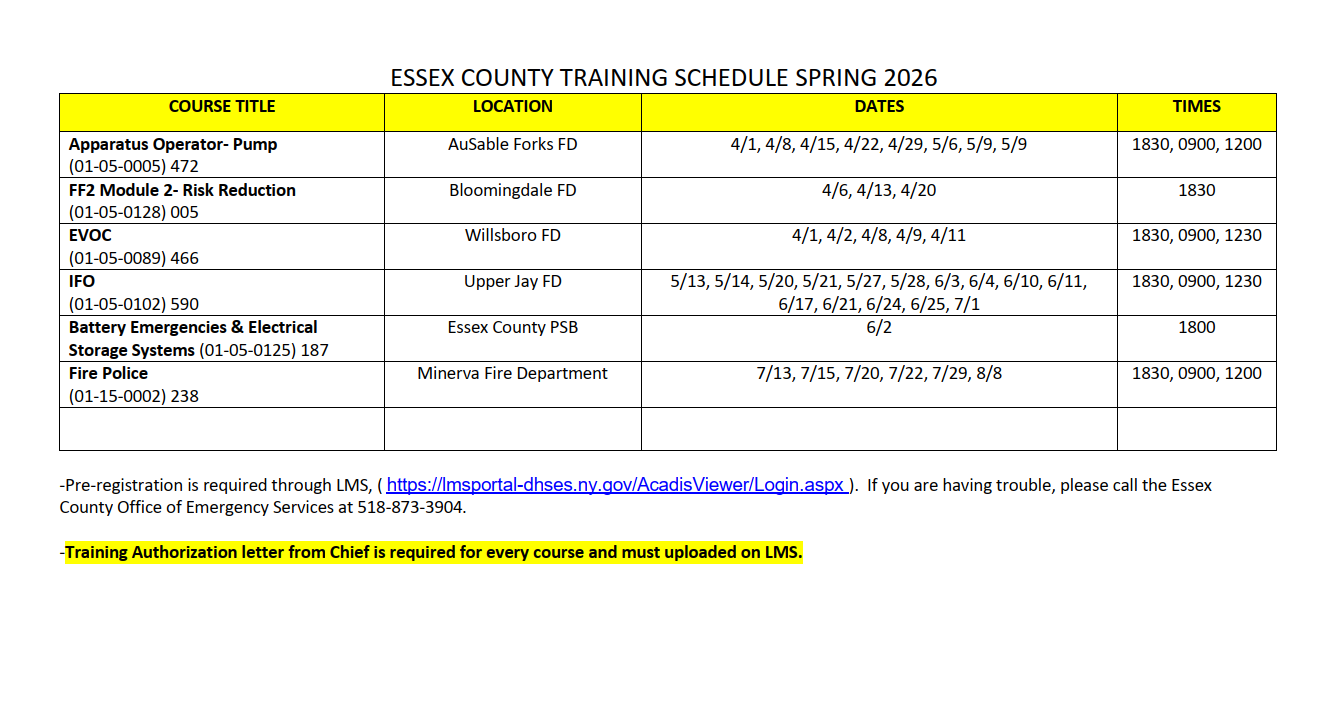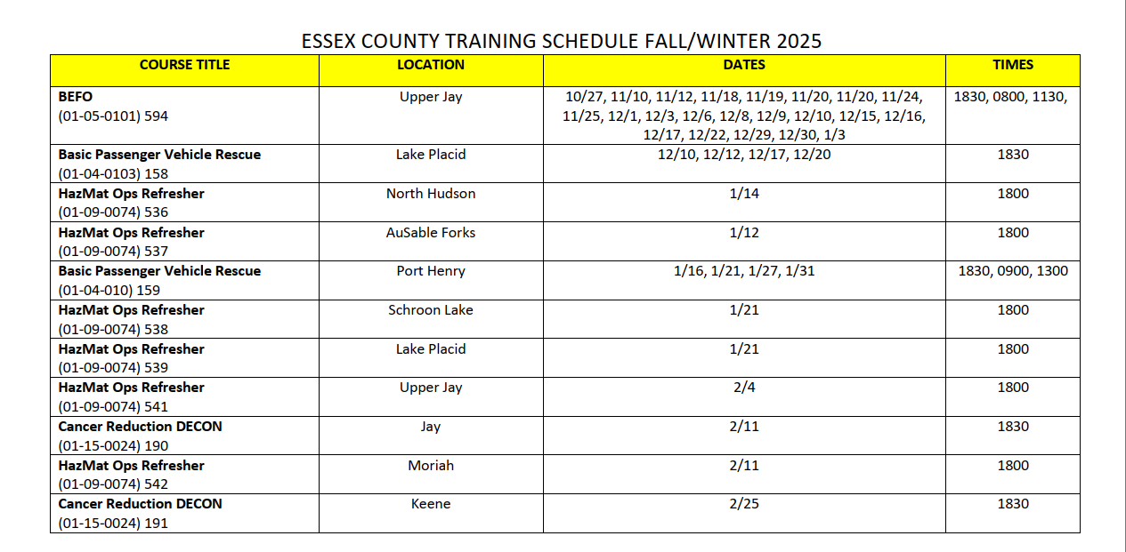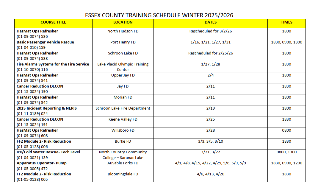 We rely on NY State Office of Fire Prevention and Control to provide high quality, comprehensive training, response and technical assistance to our local emergency responders. These training courses enable all of our fire service to become the best trained, best prepared and most effective professional emergency response force. Training can be completed locally or at the State Fire Academy.